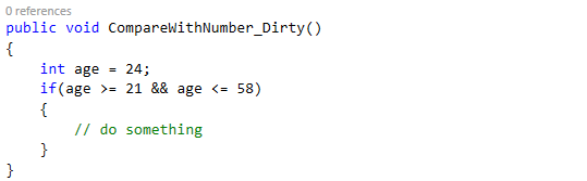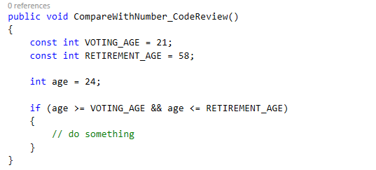 Look at the following code. It doesn't convey much information. We're just checking if age is over 21 and less than 58. Now, the problem is we have no idea why 21 or 58 is significant. To figure this out we'd need to read between the lines and by reading the function in hopes of determining exactly why the developer typed 21 or 58 here and not some other number.