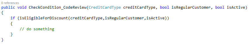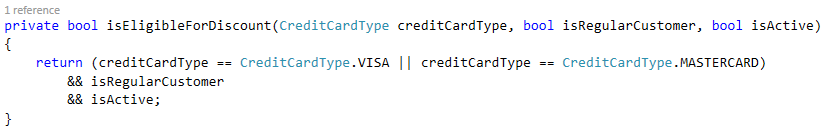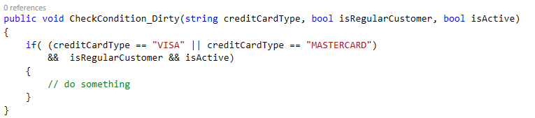 Before our conditionals grow out of control there is the approach to manage the complexity and clarify intent so that they don't end up confusing messes like Encapsulation via functions. Finally, notice that the return line now clearly describes our intent and reads like a spoken word.