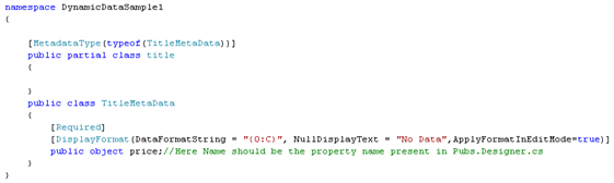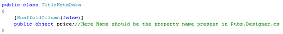 Open the solution used in previous article, goto Titles.cs class and add DisplayFormat attribute to price field present in TitleMetaData as shown below: