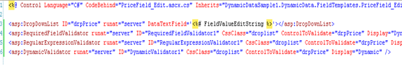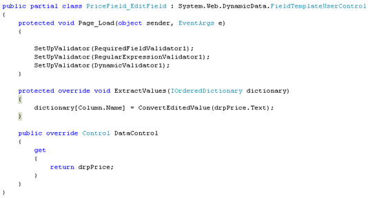 Now, add UIHint property to price object with value as PriceField. Now go to FieldTemplates in solution explorer and add a new Dynamic Data Field with name as PriceField. It will create two controls, one for displaying [PriceField.ascx] and other [PriceField_Edit.ascx] is for editing.