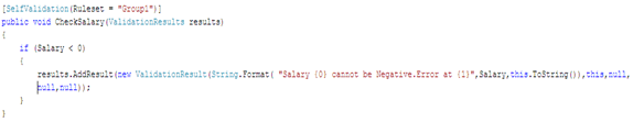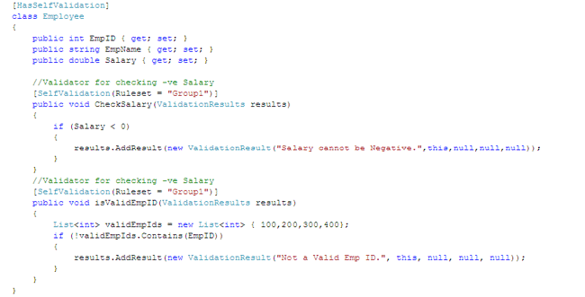Validation through custom code is called as self validation. We need to decorate the class having self validation with [HasSelfValidation]. We had defined validation methods for checking negative salary and valid emp Ids with a Self Validation attribute as shown above.