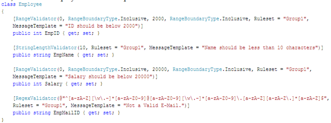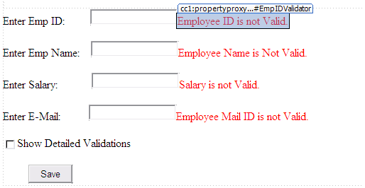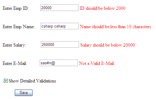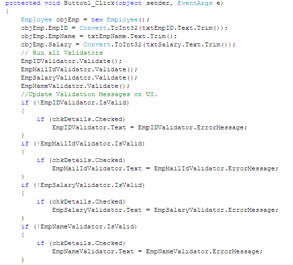 Here, Validate method will do the validations and sets IsValid property based on it. Later, we are displaying the error messages coming from validators present in Employee class if chkDetails is checked. If chkDetails is not checked, than we are displaying error message present in Text property of each Validator.