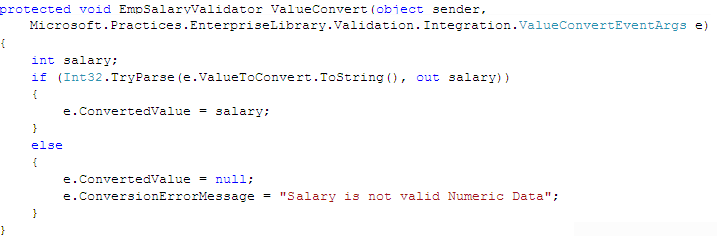 Sometimes, we might input invalid data like entering non-numeric values for salary. In order to handle that, PropertyProxyValidator is having ValueConvert event. Now, we handle invalid salary using EmpSalaryValidator as shown below:
