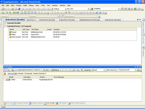 Since, we defined the order of test cases execution. First, it will execute AddNumbersTest (result will be passed), then SquareTest (result will be Failed), so it won't execute MultiplyNumbersTest at all. We can see the complete details of ordered test by double clicking OrderedTest1 in Test Results window as shown below:
