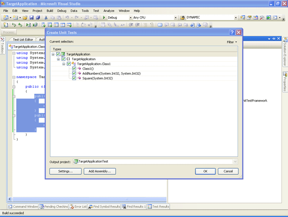 It will popup a selection window,where we can add Assembly or class for which test cases should be generated.Check TargetApplication.Class1 and click Ok to generate test cases automatically for all methods present in Class1.