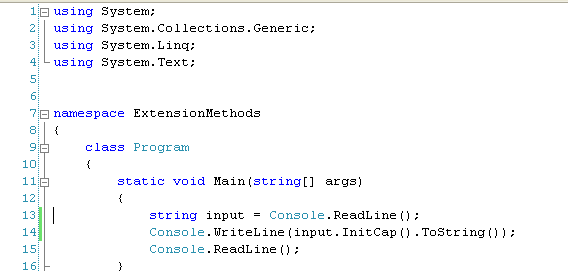 So, create a string object and read the contents from console and call this extension method InitCap on that string object. Later, display the contents.