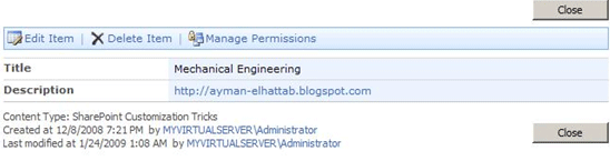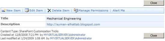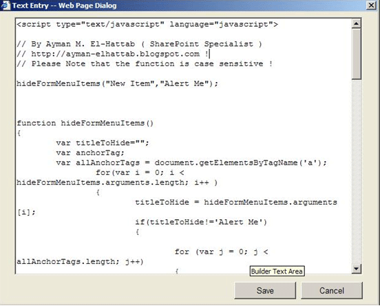 The following function can be used to hide any toolbar item in dispform.aspx. Just call the function passing the names of the items comma separated (e.g. New Items, Alert Me, etc.). The function removes the items and of course the images rendered beside them (if found). Trick #3 will deal with where and how you can add the function to your list form.