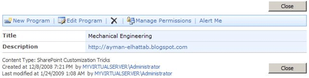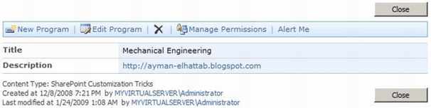 Sometimes, you need to rename some items in the toolbar rendered at the top of DispForm.aspx to match the List Name. For instance, you have a custom list named "Programs" that stores the courses offered by a university. It would be better to have "New Program" rather than the default "New Item" and "Edit Program" rather than "Edit Item". Sometimes, you just need to totally delete the text and just leave the images with a tooltip that explains the action performed on clicking them.