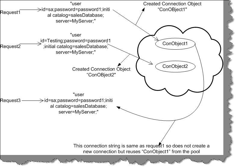 Let us try to explain the same pictorially. In the above figure, you can see there are three requests "Request1", "Request2", and "Request3". "Request1" and "Request3" have same connection string so no new connection object is created for "Request3" as the connection string is same. They share the same object "ConObject1". However, new object "ConObject2" is created for "Request2" as the connection string is different.
