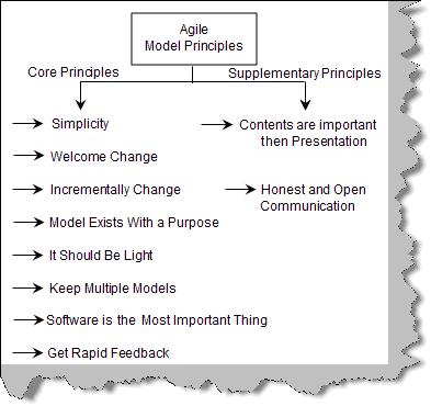 Agile modeling defines set of practices which can show us the way towards becoming successful Agile modelers. These practices are divided in to two sections one the "Core Principles" and other "Supplementary Principles". Below figure 'Agile Model Principles' shows the same in a pictorial format.