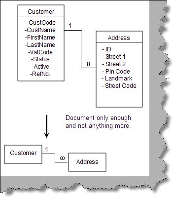 - The most important thing is we need to create documentation to provide enough data and no more than that. It should be simple and should communicate to stakeholders what it needs to communicate. For instance below figure 'Agile Documentation' shows two views for a simple class diagram. In the first view we have shown all the properties for "Customer" and the "Address" class. Now have a look at the second view where we have only shown the broader level view of the classes and relationships between them. The second view is enough and not more. If the developer wants to get in to details we can do that during development.