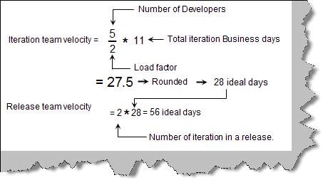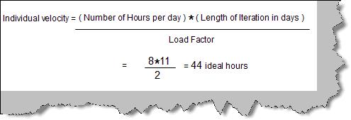 Individual Velocity determination defines how many how many ideal hours a developer has within one iteration. Below figure 'Individual Velocity Calculation' shows in detail how to get the number of ideal hours in iteration for a developer. Below is a sample calculation which shows with 8 hours a day , iteration of 11 days and load factor of 2 ( i.e. developer code for only 50% time i.e. 4 hours) , we get 44 ideal hours for developer in that iteration.
