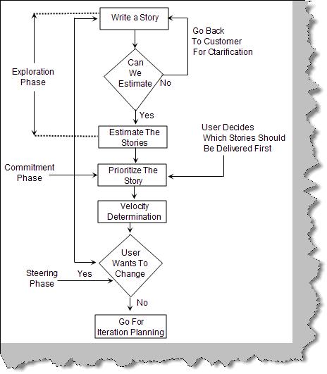 Exploration: - In this phase requirement gathering is done by using user story concept (Please read the previous question on user story to understand the concept of user story). In this phase we understand the requirement to get higher level understanding. Please note only higher level. User story card is size normally 3 X 5 inch, so you can not really go detail in that size of card. We think it's absolutely fine rather than writing huge documents it sounds sense to have to the point requirement paragraphs. So here is a step by step explanation of how the exploration phase moves :-