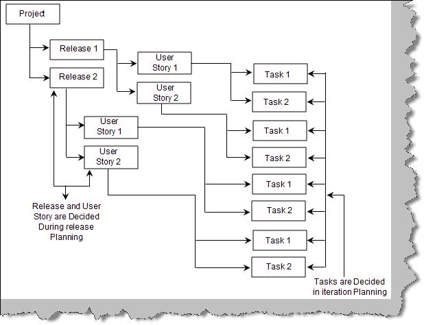 One of the important points to realize is project is broken down in to set of releases a which is further analyzed using short user stories à user stories are further broken in to task ,which is estimated and executed by the developer. Once one release is done the next release is taken for delivery. For instance the below project shown in figure 'Release, Stories and Task' has two releases one and two.