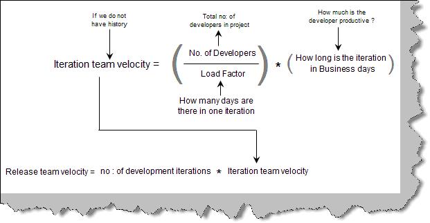 Velocity determination defines how many user stories can be completed in one iteration. So first the user decides the length of the iteration. Length of iteration is decided depending on the release dates. Velocity is normally determined from history. So what ever was the last team history velocity same will be used in the further estimation. But if there is no history then the below formulae will be used:-