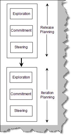 So let's explore both these phases in a more detailed manner. Both phases "Release Planning" and "Iteration Planning" have three common phases "Exploration", "Commitment" and "Steering".