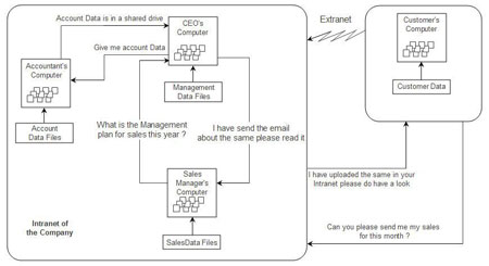 Share point helps team members to connect and exchange information in a collaborative manner. It helps to centralize enterprise information for efficient functioning. For instance below is how a normal organization works. Files and documents scattered in individual PC and data is transported according to custom protocols. The communication protocol for sending these data is also person dependent. Some body would use a email , some body would share a drive etc etc.