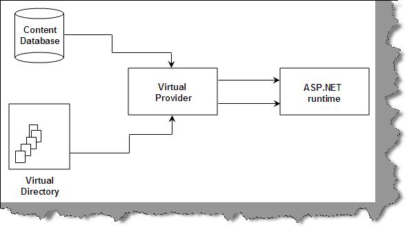 So in other words we need an abstract mechanism by which we can render pages from SQL Server content database and also from the virtual directories. This is achieved by using the virtual provider provided by SharePoint. So for all customized pages virtual provider reads from the content database and passes the same to the ASP.NET runtimes. For all common pages it goes to the directory, parses it and the passes the same across to the ASP.NET runtime.