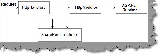 Using the HttpHandlers and HttpModules request is first passed through the Share Point runtime and then passed to the ASP.NET runtime (aspnet_isapi.dll).