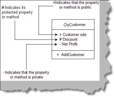 In order to represent visibility for properties and methods in class diagram we need to place symbols next to each property and method as shown in figure "Private, Public and Protected". "+" indicates that it's public properties/methods. "-"indicates private properties which means it can not be accessed outside the class. "#" indicate protected/friend properties. Protected properties can only be seen within the component and not outside the component.