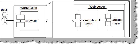 Deployment diagrams represents an overall static view of how software and hardware nodes in the application. They show what the hardware is and which components are installed on which hardware. In deployment diagram we represent the hardware with a solid box and simple underlined text description showing which hardware is it. You can have more than one component on a single hardware. So the browser is an application UI which resides on the workstation computer and the database and web server resides on the web server hardware. Deployment diagram can be more complex with firewalls, payment gateways, PDA devices, VPN etc.