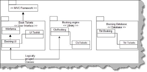 2 and 3 - 'Book tickets' is the second package which inherits from the MVC model. The stereo type is '<<application>>' which means it's a user interface.