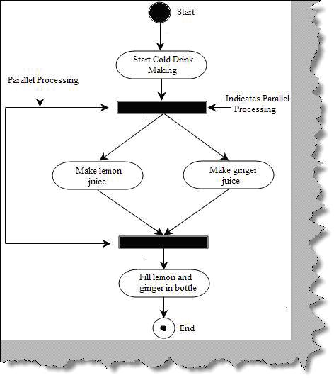 There are situations in project where we need to execute two parallel activities in a project. A solid bold line represents from where the activities will split and execute in parallel and then again a solid line is where the parallel activities will meet. For instance in the below figure 'Parallel Processing' we can see how 'Make lemon juice' and 'Make Ginger Juice' activities are executed in parallel.