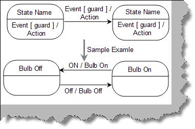 Type 2:- The guard is optional. For instance sometimes we only have events and actions, i.e. with out the guard. For instance when the even 'On' happens the action is that 'Light Bulb is on'.