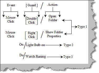 Type 1:- This methodology of writing is used when we need to map an event with action using a guard. For instance in the above figure 'Types of Event and Action' shows the event --> mouse click, guard --> double click and the resulting action --> open folder.