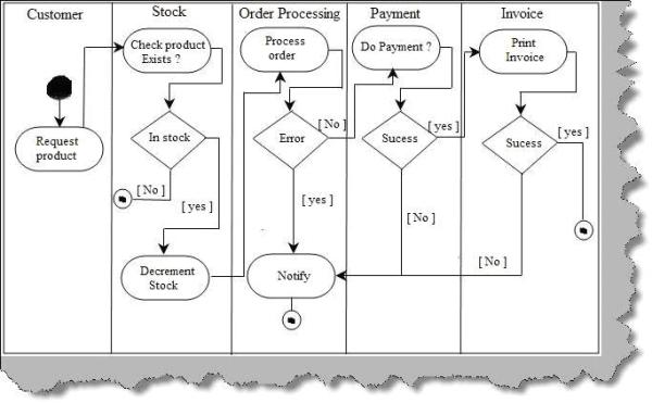 Now see the below figure 'With Swimlanes' we have partitioned the activity to the respective objects like Customer, Stock, Order processing, Payment and Invoice. These partitions are termed as 'Swimlanes' , so if you feel that the activity diagram is complex think about using 'Swimlanes' it can really make your activity diagram readable.