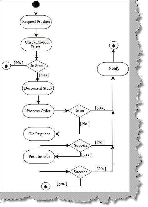 Activity diagram are used to capture complicated process flows in a system. Below figure 'Activity' shows a simple activity diagram. Some of the points which you can easily note from the activity diagram figure are:-