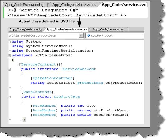 First thing you will need is to create the SVC file, which exposes the service class. SVC file contains the pointer to the class. You can see from the figure below the class attribute points to the class whose interface is exposed by the service.svc.cs file. Also, note the actual interface is in service.svc.cs file. Below figure, have both the files service.svc, which has the class attribute which points to the service class, and the interface, which resides in service.svc.cs file. We have taken the same sample, which was self-hosted in the previous question.