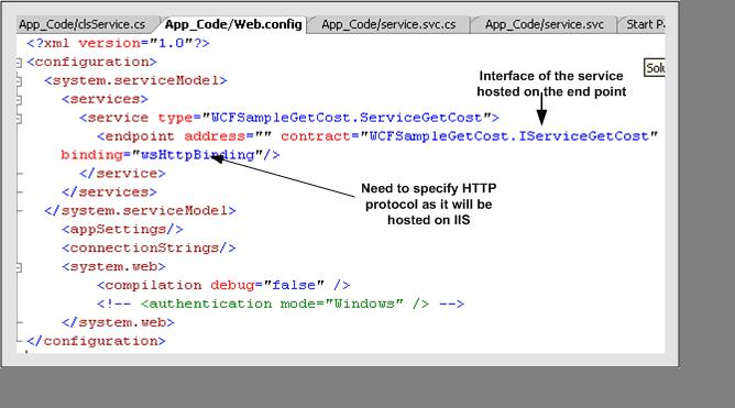 We also need to specify the service type and endpoint in web.config file. Also, note we have specified HTTP binding because we will be hosting the service on IIS.