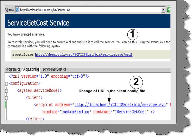 Using the Svcutil.exe, you will need to generate the proxy class and the config file. The proxy and config will be same, as we had done for self-hosting. The one important change is the address. The config file URL now points to the service.svc, which is hosted on IIS. You can run the same client, which we had created for self-hosting. The only change you will need to do is change the endpoint address.