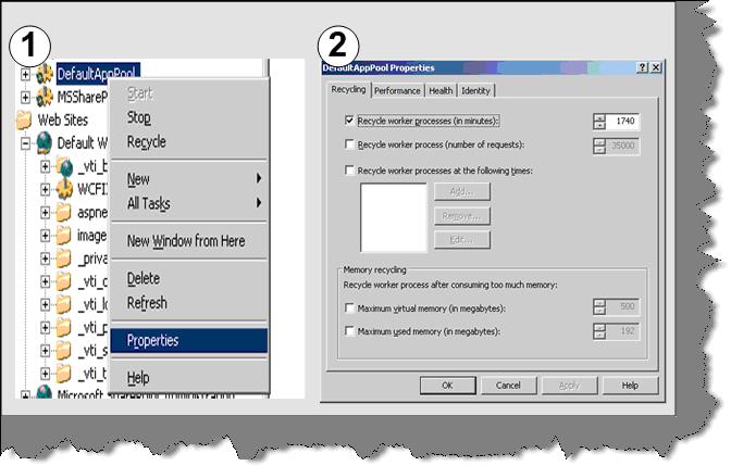 If IIS finds that a service is not healthy that means if it has memory leaks etc, IIS recycles the process. Ok let us try to understand what is recycling in IIS process. For every browser instance, a worker process is spawned and the request is serviced. When the browser disconnects the worker, process stops and you loose all information. IIS also restarts the worker process. By default, the worker process is recycled at around 120 minutes. So why does IIS recycle. By restarting the worker process it ensures any bad code or memory leak do not cause issue to the whole system.