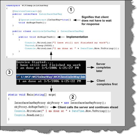 In order to understand one-way implementation in WCF lets make a code walkthrough of a sample.