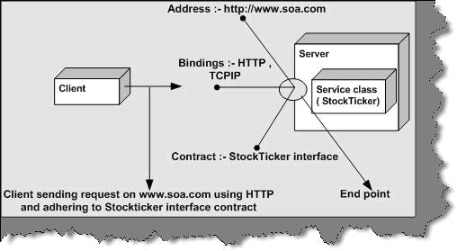Below figure, show the three main components of end. You can see the stock ticker is the service class, which has an end hosted on www.soa.com with HTTP and TCP binding support and using Stock Ticker interface type.