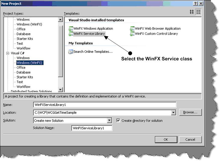 First, you need to create a Winfx service project. You can see in the below figure we have selected the Winfx project.
