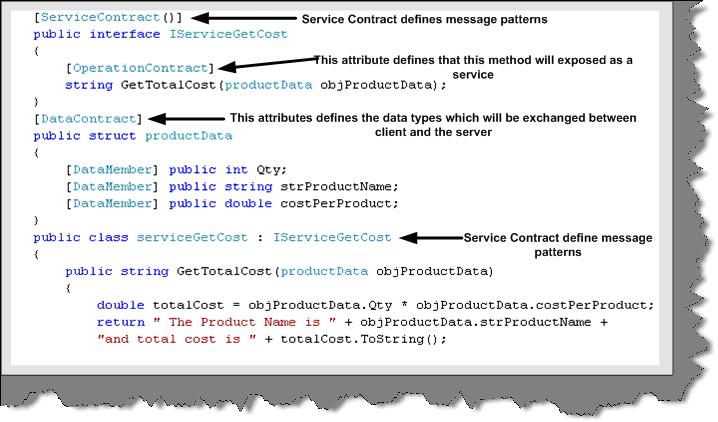 The next thing to note in the code snippet is the Data Contract attribute. In the previous two steps, we have exposed class as a service by using Service Contract and methods by using Operation Contract. Every operation will definitely do some kind of data transfer.