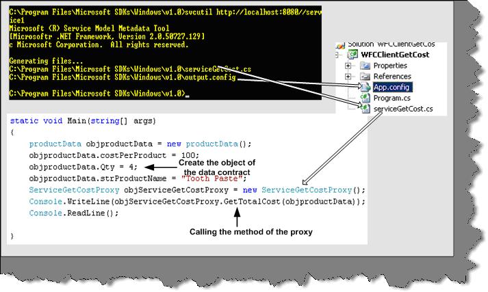 Once we have done with everything, its time to write the client code, which calls the proxy who in turn will call the service hosted. In the above figure, you can see we have the client code also. It is a simple code we first created the object of the data structure set the values. Then we create the object of the service and call the GetTotalCost function.