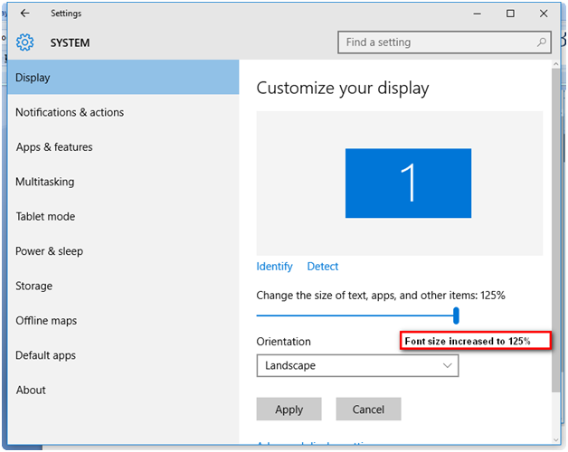 Step 4: Now I am trying to increase the overall size of the display to 125%.