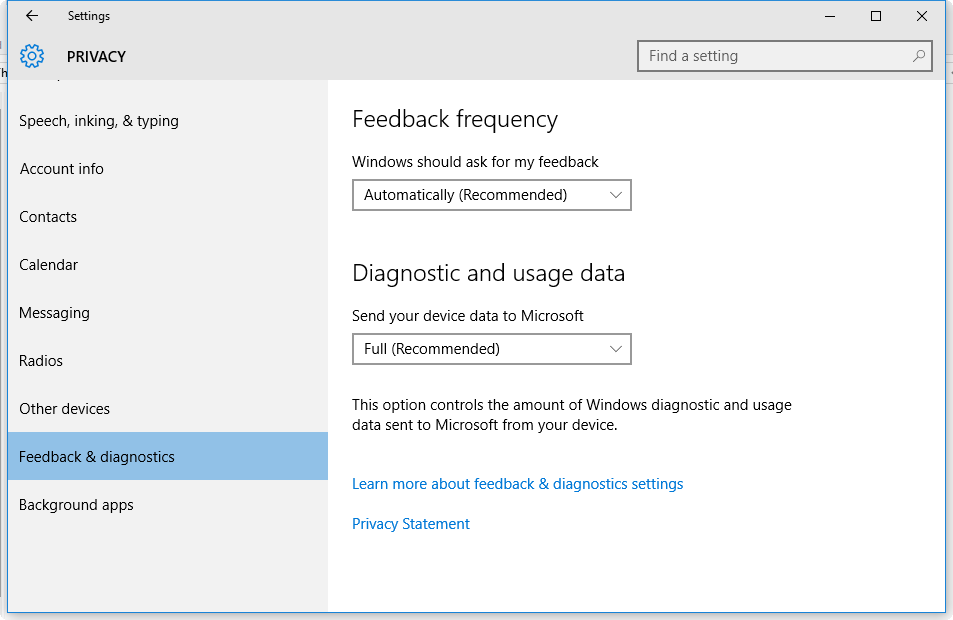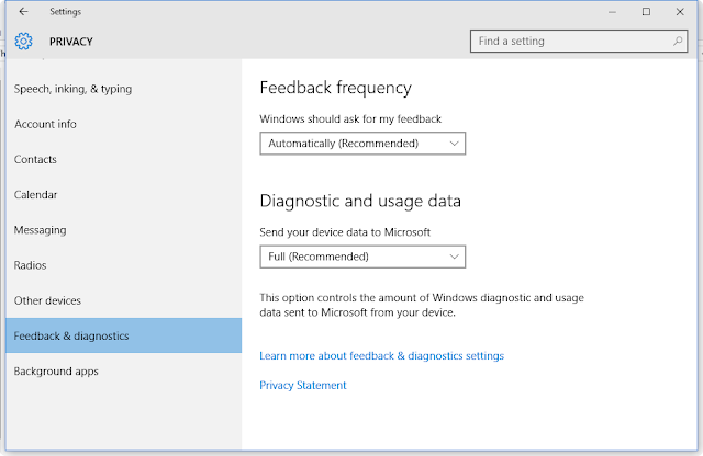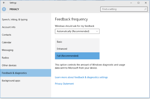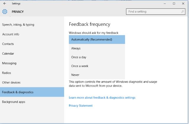 Feedback frequency" and also diagnostic information to Microsoft. This would help us to send feedback and the device data directly so that it is easy for Microsoft to evaluate Windows 10 performance regularly.