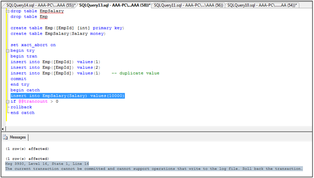 When the value of XACT_ABORT is set to ON, the error – “The current transaction cannot be committed” occurs when another transaction is begun before a commit or rollback of the previous executing transaction. Here are few instances that invite this error: