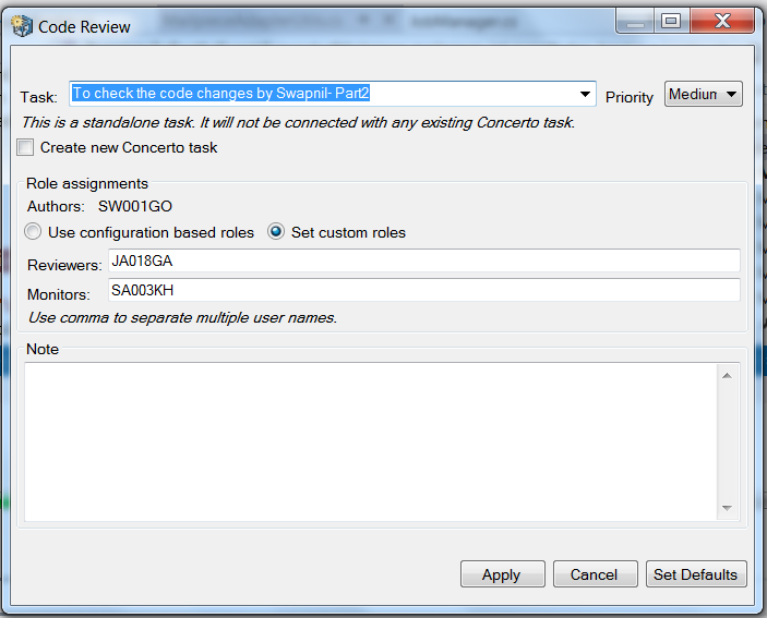- Go to the Code Review tab and add the Authors (the developer name), Reviewers (who reviews the code), Auditors (Super user like Manager, who oversees the entire process).