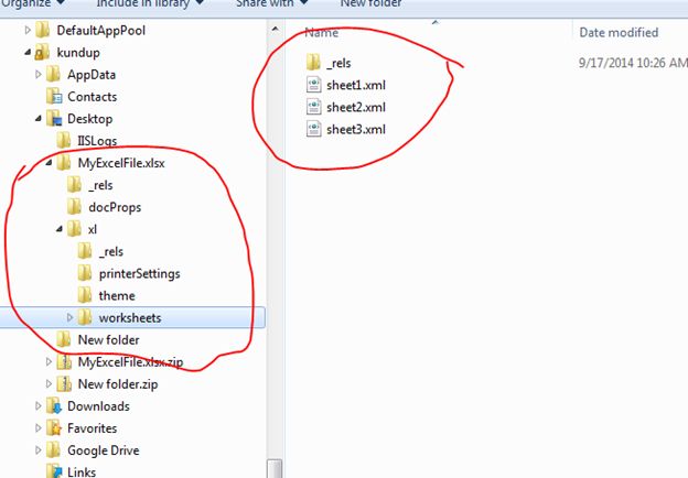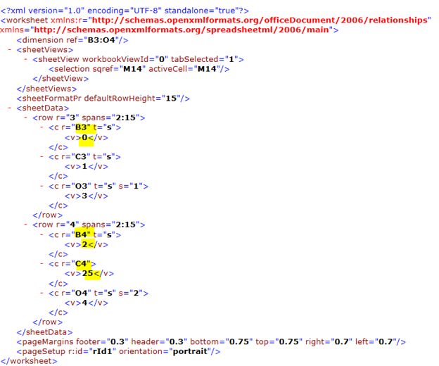 It's important to understand this structure since it is the base for the design. If you open the xl folder you can see that the sheets are saved as simple XML files: