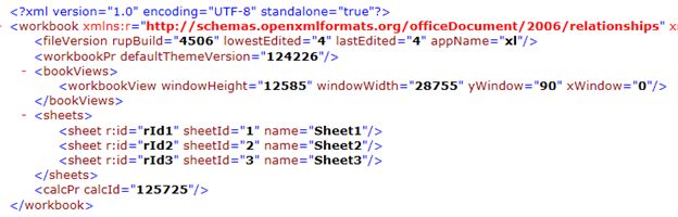 This is the main XML that is having all of the sheet's reference ids and names. If you open the workbook it should look like this: