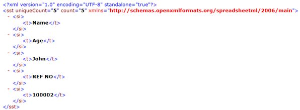 See the “Sheet data” maintains the Cell reference and Cell Value. A Shared String is a database in an XML package to store all common strings in a single place and the reference is stored in the sheet.