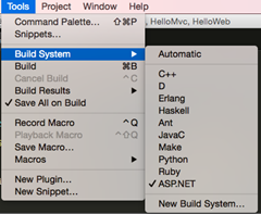 If you see any build errors in the code then you can open the web application in the Sublime editor and fix the build errors if there are compilation errors. To build the ASP.Net from the web first change the setting in the Project menu item. Change the Build System to ASP.Net.