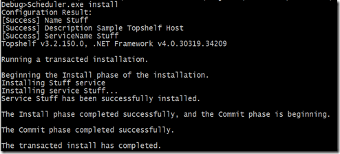 SampleService.exe installYou will see some success log output on the command prompt: