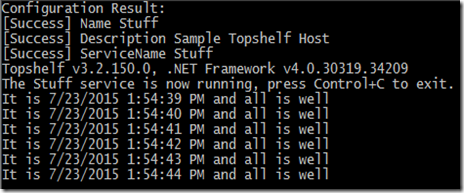 And I can see my service has begun and is running. How cool, isn't it? I'm sure this kinda stuff will make the DevOPs guys happy. There are many configuration options that make use of this library easy. I can say that the OOS stack of .NET is coming into the picture and helping developers making software better and better everyday.